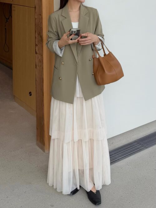 ホワイトのティアードスカートを合わせて軽さと動きをプラスし、柔らかな印象に仕上げています。