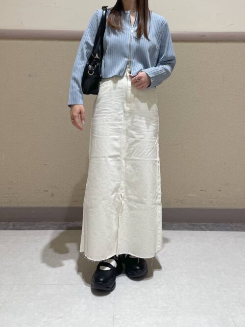 グレイッシュブルーのカーディガンにホワイトのロングスカートを合わせた爽やかな春コーデ♪