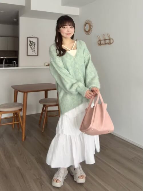 キャミソールにペールグリーンのざっくりカーディガンを合わせた抜け感のある春コーデ♪