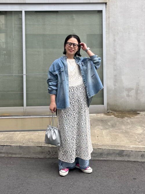繊細なレースワンピースにデニムを重ね軽やかなレイヤードコーデ。