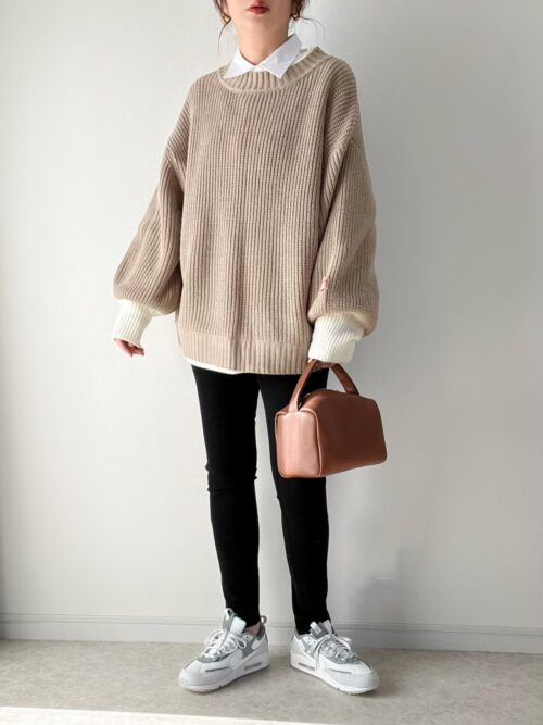 ニュアンスベージュのオーバーサイズニットに襟付きの白シャツをレイヤードした大人のカジュアルコーデ♪