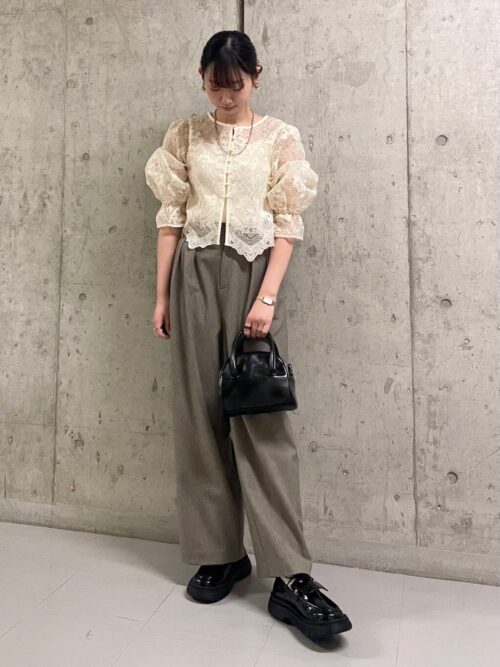 レーストップスはあえて甘さを抑えたグレーを合わせることで上品さと今っぽさを演出しています。