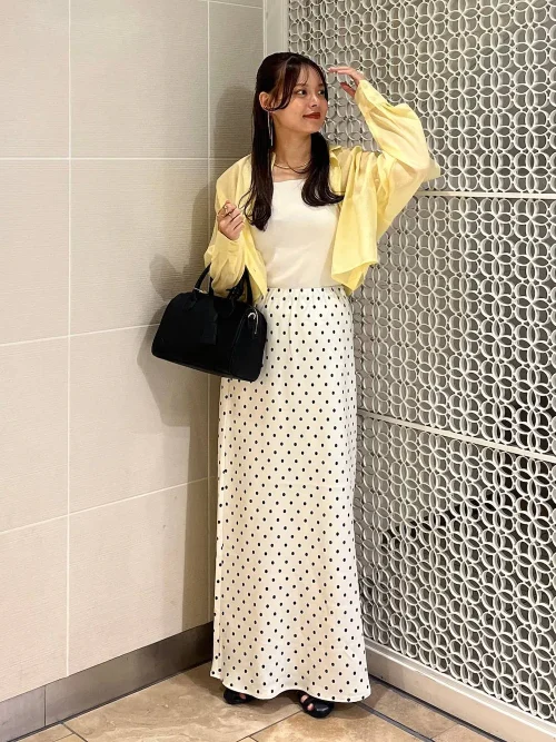 柔らかなとろみ素材のイエローブラウスにドット柄のスカートを合わせて華やかな春コーデに♡