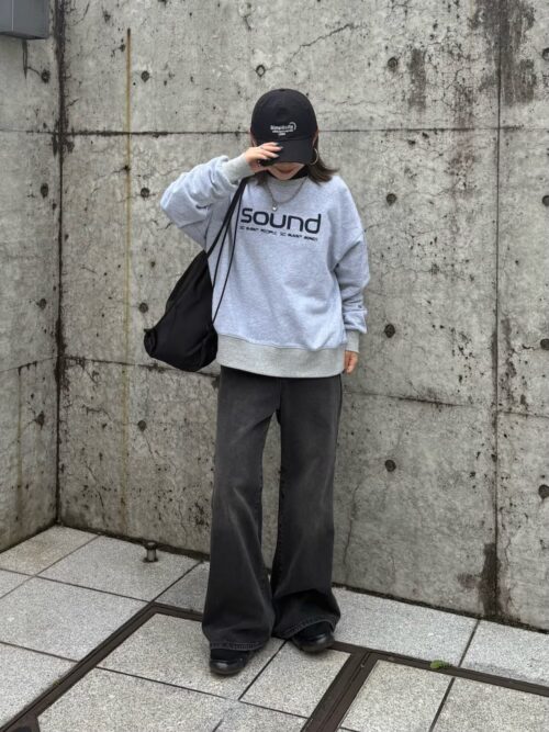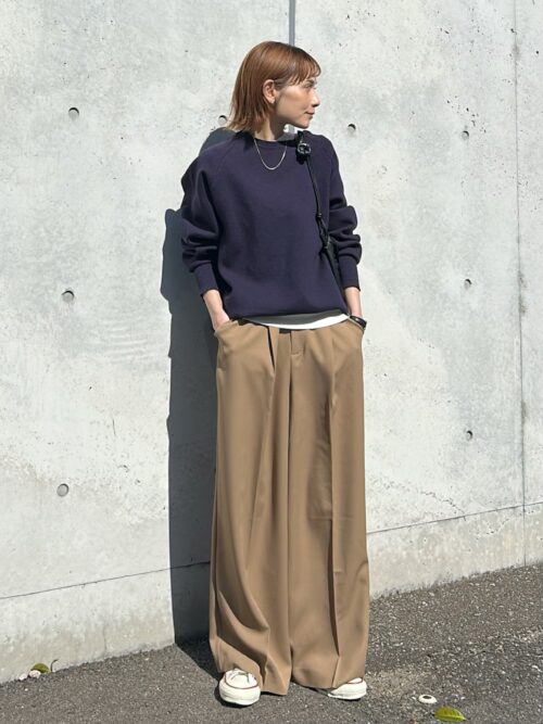 ラフなスウェットもボトムスに存在感があることでバランスよくまとまります。