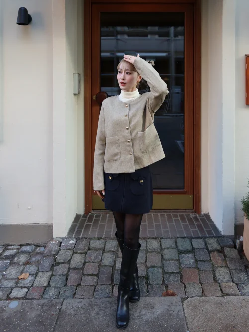 タートルニットにノーカラージャケットを羽織った今季らしい軽アウターコーデ♪