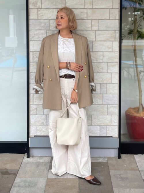 クリーンなホワイトをベースにすることでジャケットの柔らかなベージュが引き立ち、洗練された印象になりますね。
