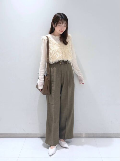 レーストップスにフェザーベストを重ねた上品でキレイめな春コーデ。