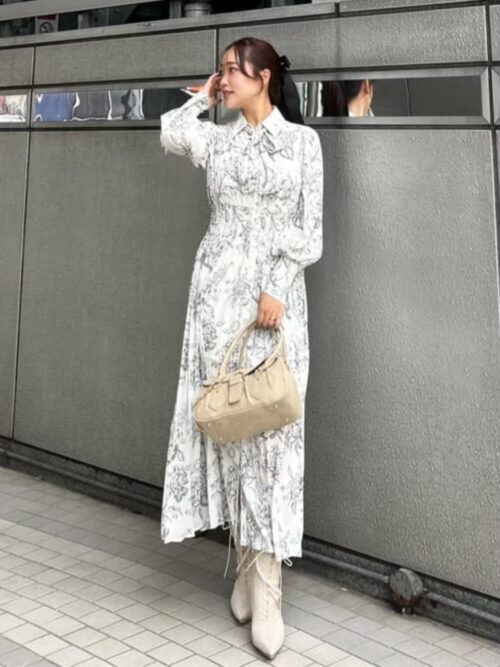 花柄ワンピースにホワイトのブーツを合わせた春らしいフェミニンコーデ。
