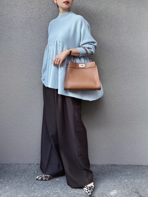 ブルーのペプラムニットは春らしさ満点◎