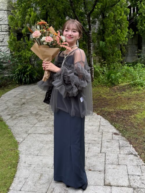 ボリュームのあるフリルが動きに合わせて揺れ、エレガントで存在感のある結婚式コーデに仕上がります。