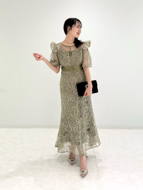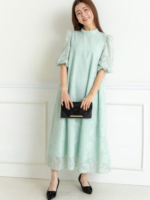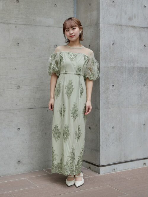 ロング丈の淡いグリーンドレスは、歩くたびに揺れるエアリーな袖が優雅な印象を演出。