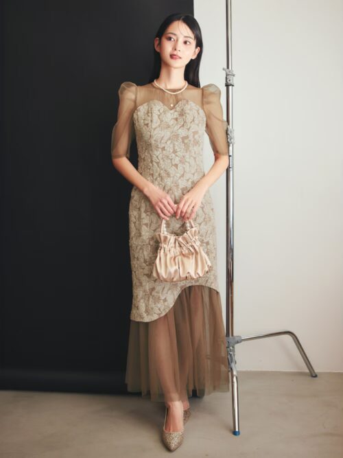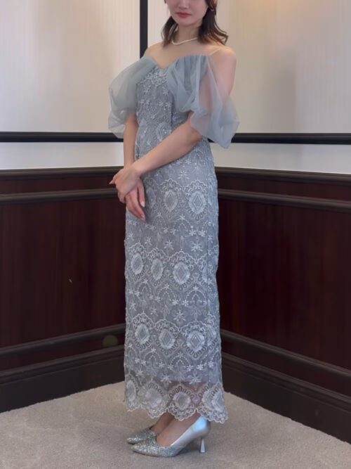 着用ドレス:Kana 刺繍レース チュールスリーブ コクーン パーティドレス
