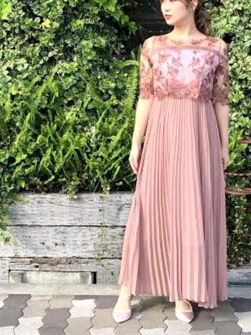 着用ワンピース:Cupid Heart オリジナル模様柄刺繍レース使い プリーツ加工ミモレ丈ワンピースドレス