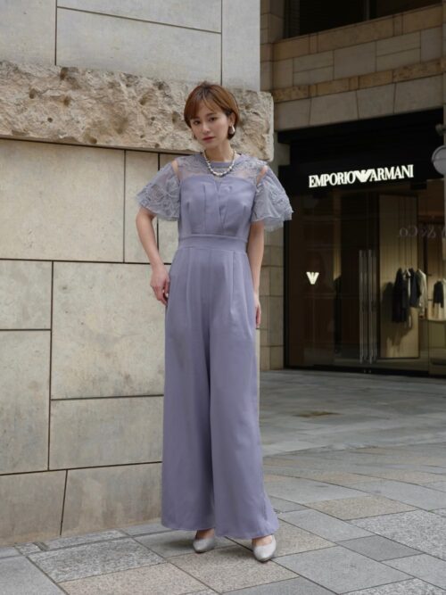 ラベンダーカラーのパンツドレスは、ガーデンウエディングにぴったりの軽やかで華やかな装い。