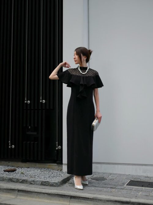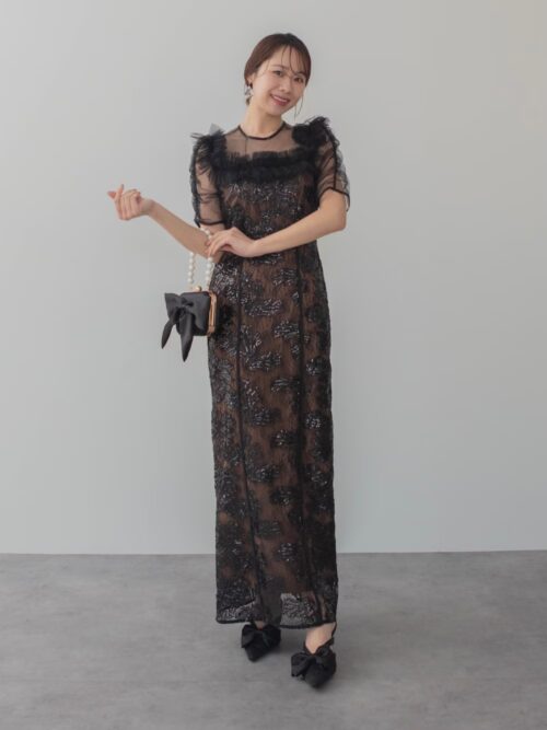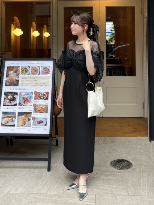 チュール素材を重ねたブラックドレスは、軽やかさと華やかさを両立したデザイン♪