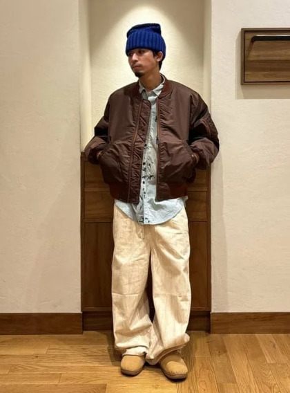 デニムやチノ、ワークパンツなどと合わせると、こなれ感が一気に出ます。