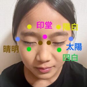 ②額両サイドからこめかみを通って、最後にこめかみのツボを押したら終了。