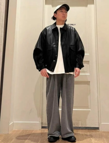 レザーブルゾン×スウェットパンツ