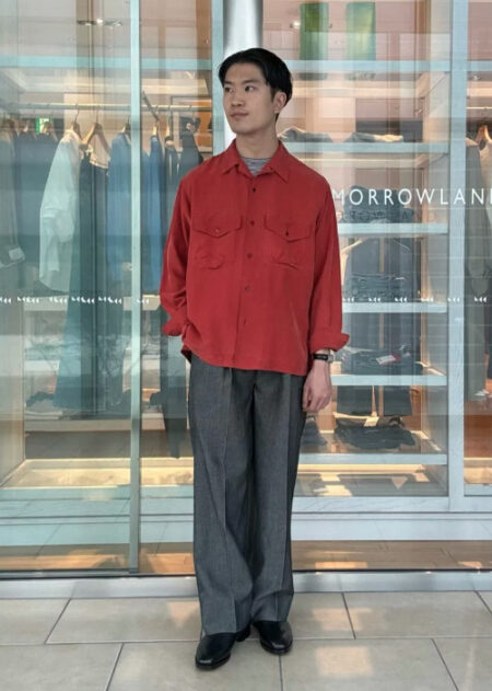 紅葉を連想させるようなきれいな発色のシャツは季節感も出せるアイテムです。